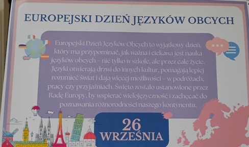 26 września społeczność naszej szkoły z radością obchodziła Europejski Dzień Języków Obcych, który obchodzony jest zawsze tego dnia od 2001 roku z inicjatywy Rady Europy i we współpracy z Komisją Europejską. Wydarzenie to odbyło się po raz pierwszy w naszej szkole. Organizatorami tej akcji była nauczycielka języka angielskiego we współpracy z Samorządem Uczniowskim. Celem akcji było podkreślenie znaczenia nauki języków obcych oraz otwartości na różnorodność kultur. Tegoroczne hasło to “Languages open hearts and minds”-”Języki otwierają serca i umysły”