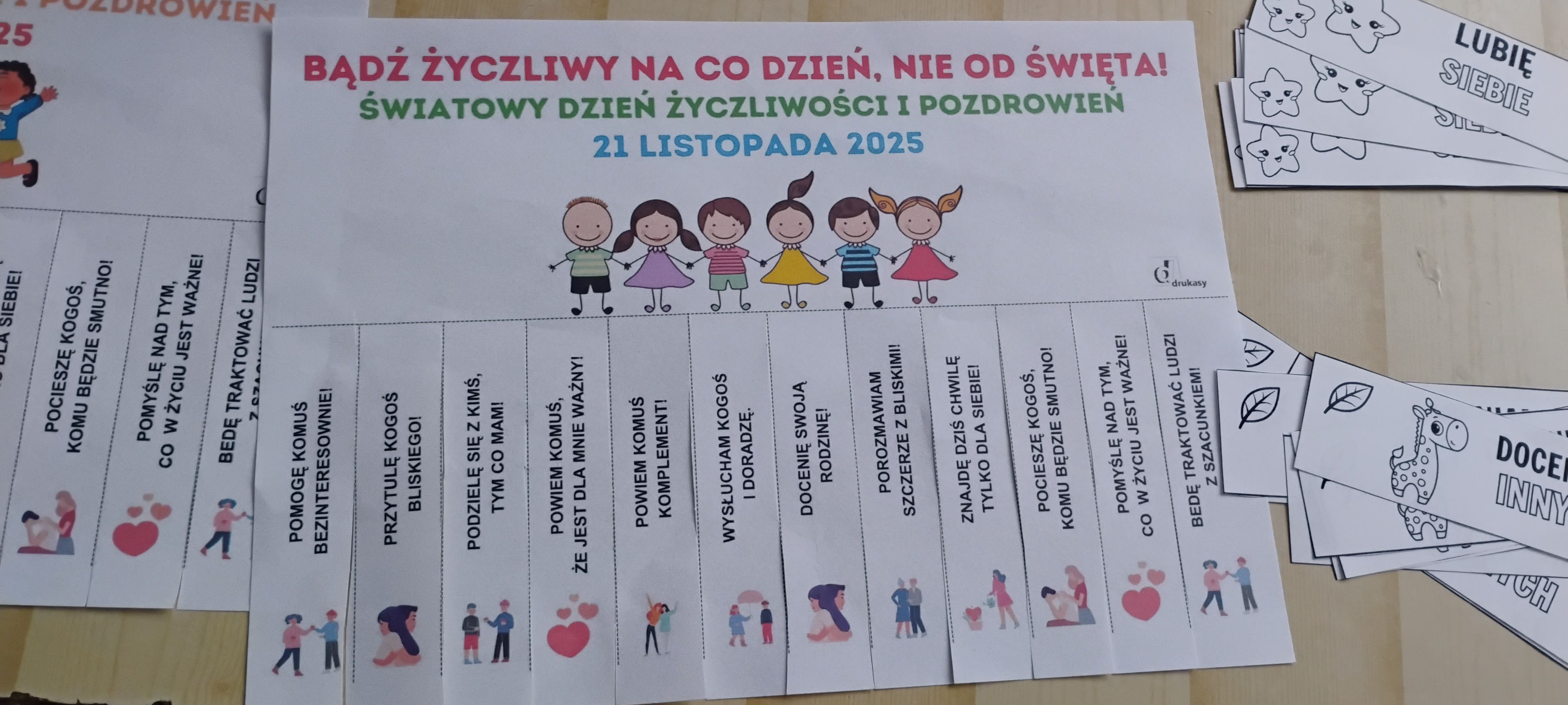 Oprócz tego Samorząd Uczniowski przygotował specjalne losowanie inspirujących cytatów o życzliwości. Aby umilić ten dzień cała społeczność szkolna z ochotą świętowała ten wyjątkowy dzień – przygotowane zostały także kolorowanki oraz pozytywne zakładki, które uczniowie mogli kolorować w dowolnym czasie. Nie zabrakło gier z kostką i gestów uprzejmości. Pozytywna energia i miła atmosfera unosiła się po szkole cały dzień.