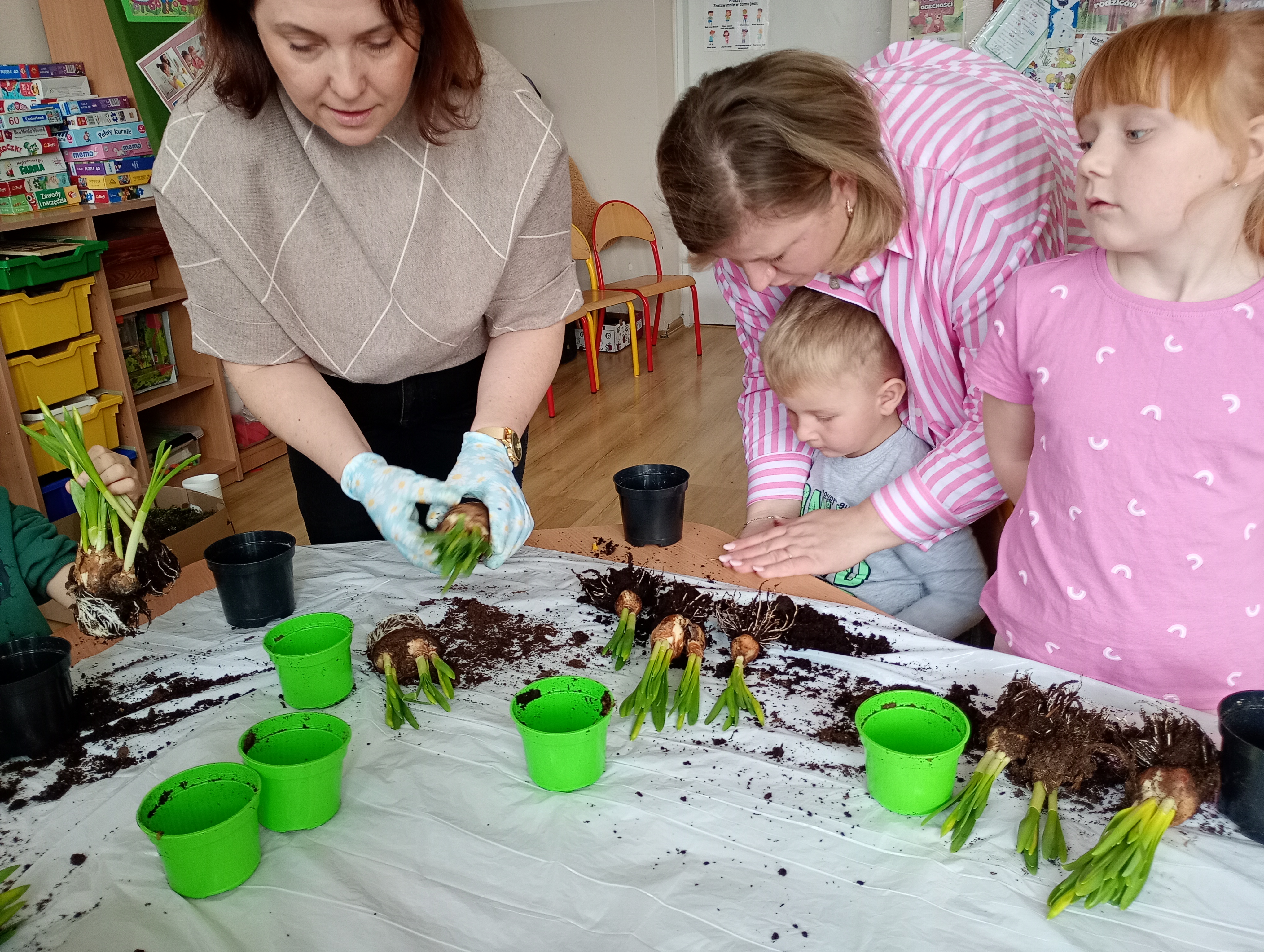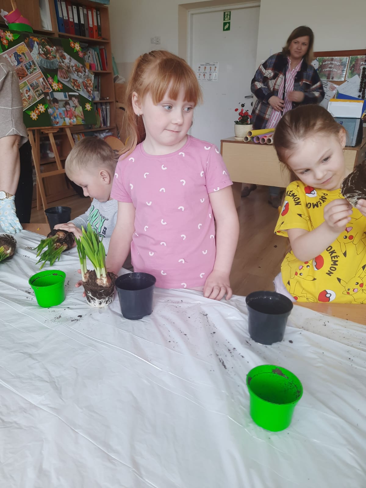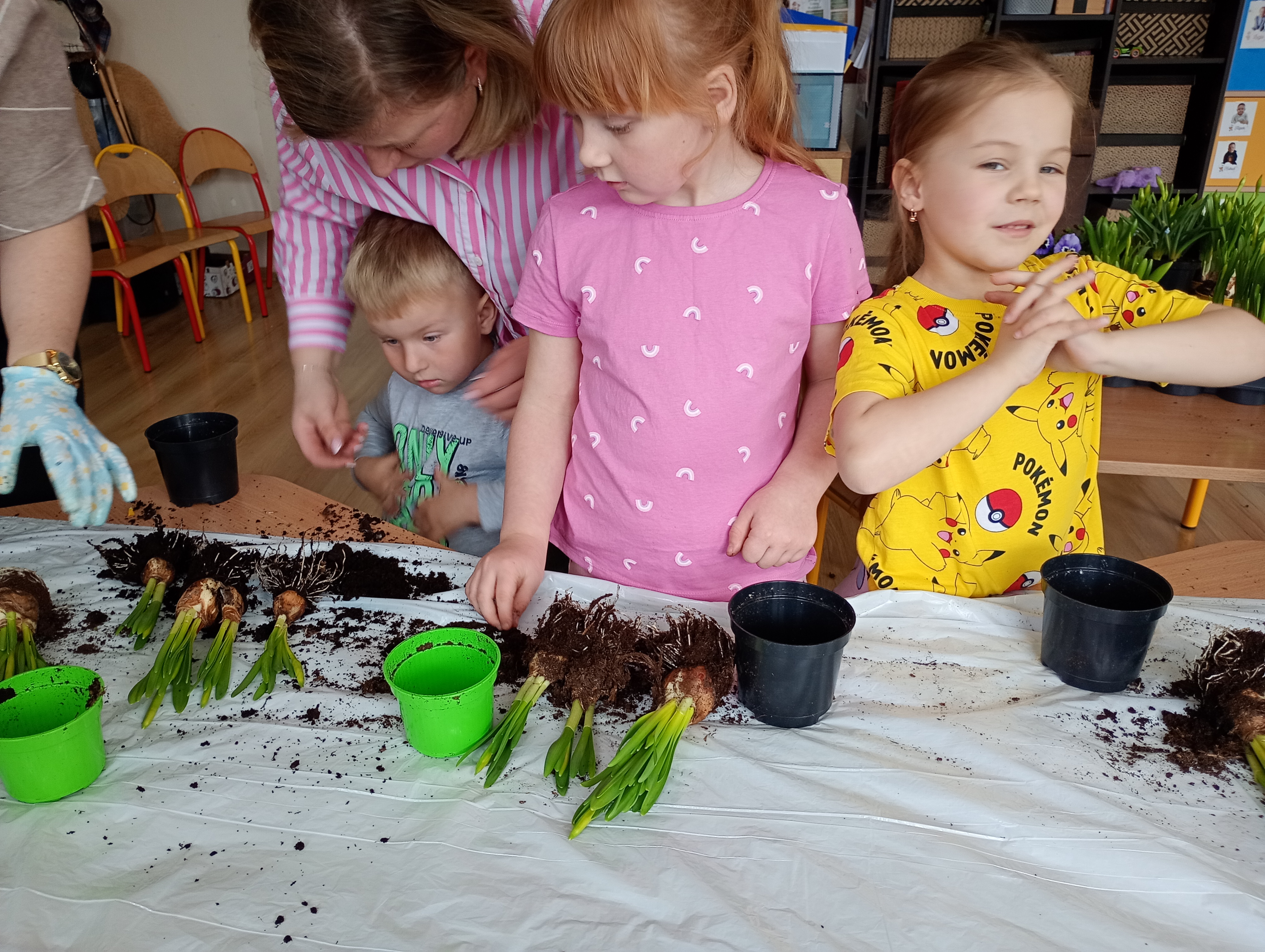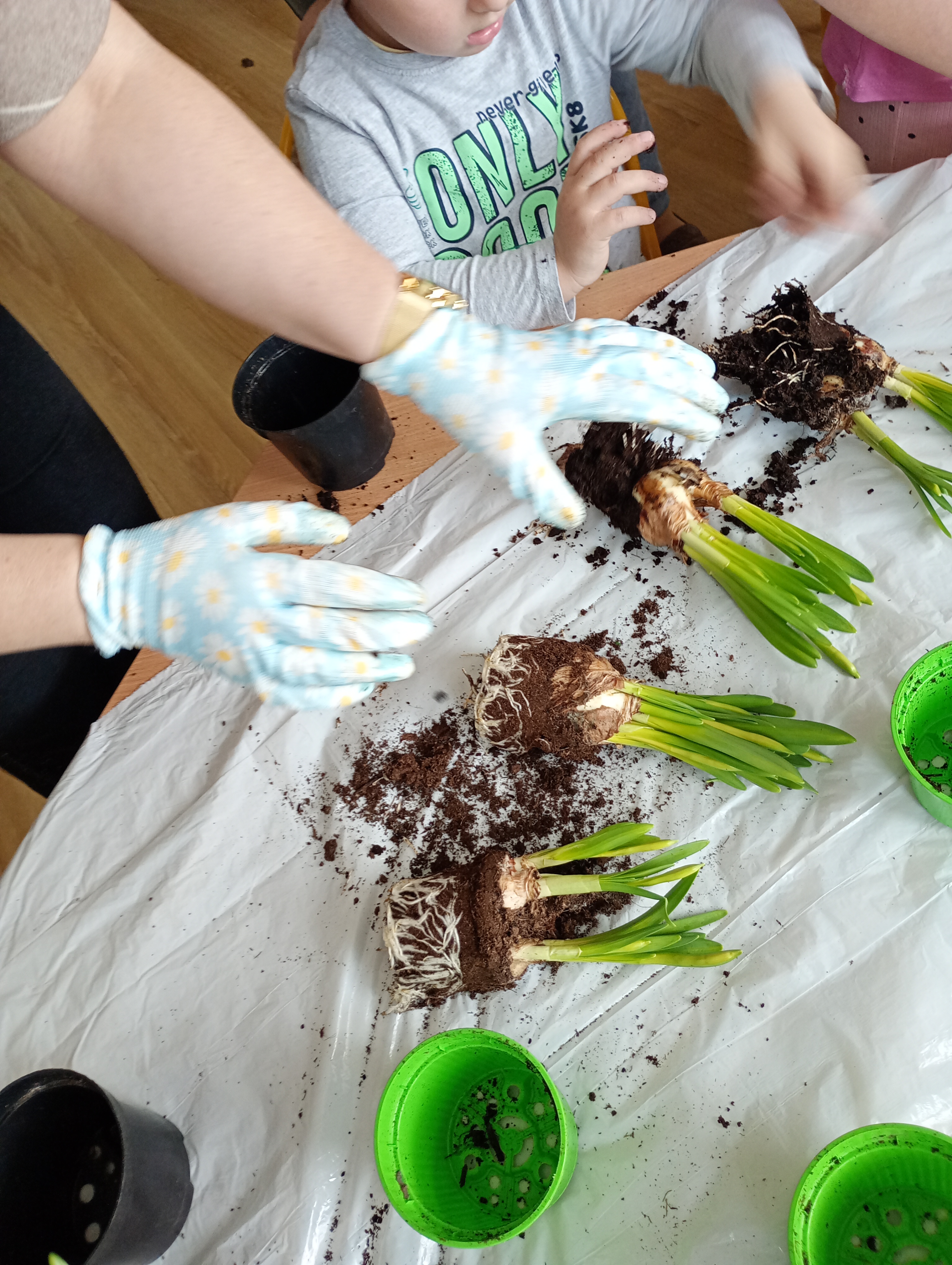Sadzenie żonkili: Każdy przedszkolak samodzielnie posadził cebulkę tych wiosennych kwiatów.