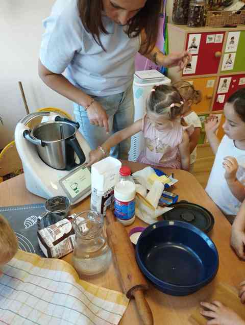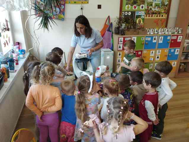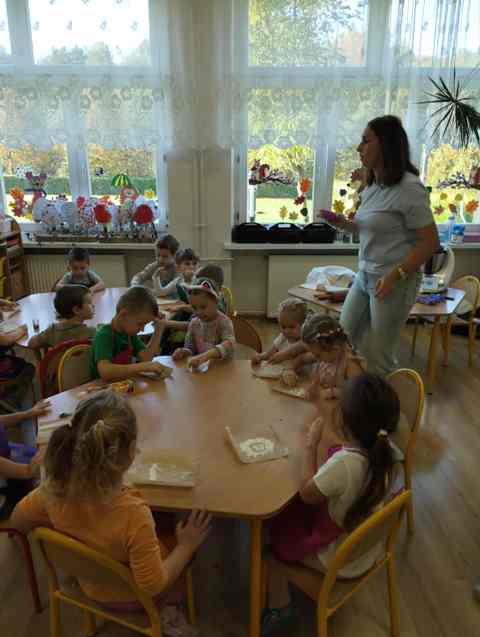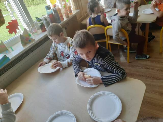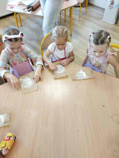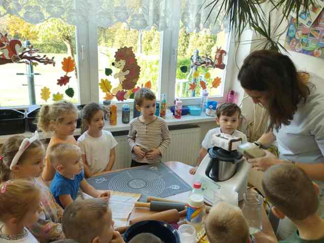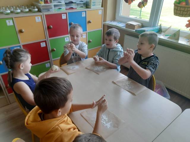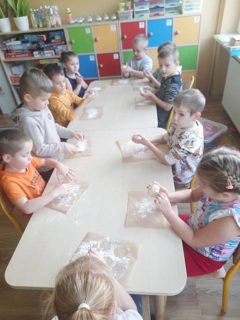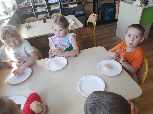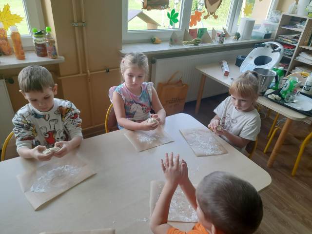 Na początku dowiedziały się w jaki sposób powstaje chleb oglądając historyjkę pt. „Od ziarenka do bochenka.” Mogliśmy także sprawdzić właściwości mąki, soli i cukru, choć ich barwa jest taka sama to struktura i smak się różnią, o czym przedszkolaki przekonały się używając własnych zmysłów. Porównaliśmy także wygląd współczesnych i dawniejszych wałków do ciasta, wag i stolnic. Na początku dzieci poznały etapy pracy nad wytwarzaniem chleba oraz uświadomiły sobie, że chleb jest produktem ciężkiej pracy wielu ludzi. Wiedzą już, że rolnik sieje i zbiera ziarna z pola, potem zawozi je do młyna. Młynarz miele zboże na mąkę, a piekarz wyrabia ciasto z maki soli, wody i drożdży. Chleb wypieka w gorącym piecu. Świeże pieczywo rozwozi się do sklepów. W tym dniu dzieci wraz z paniami z grupy zobaczyły jak ziarenka pszenicy zmieniają się w biała mąkę, obserwowały również jakie składniki były potrzebne aby zarobić ciasto. Kiedy ciasto już pięknie podrosło, samodzielnie formowały cudowne bułeczki, które lada moment trafiły do przedszkolnej kuchni. Kiedy były już gotowe nikt w szkole nie miał wątpliwości jaki zapach roznosi się w całym budynku. Część swoich wypieków dzieci zjadły po obiedzie w sali przedszkolnej, a resztę zabrały do domu. Wypieki pojawiły się również na twarzach naszych najmłodszych, którym gotowanie sprawiło mnóstwo przyjemności i z pewnością jeszcze kiedyś to powtórzymy.