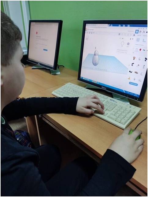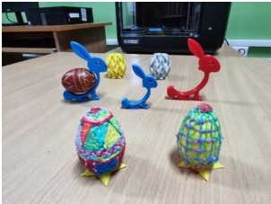 W marcu na lekcjach informatyki uczniowie klasy V doskonalili umiejętności projektowania i obsługi drukarki 3D. W programie Tinkercad tworzyli projekty ozdób świątecznych tj. jaja wielkanocne, zajączki, kurczaki itp. Po wydrukowaniu prace były jednokolorowe więc uczniowie klas młodszych przystąpili do ich ozdabiania za pomocą długopisów 3D.