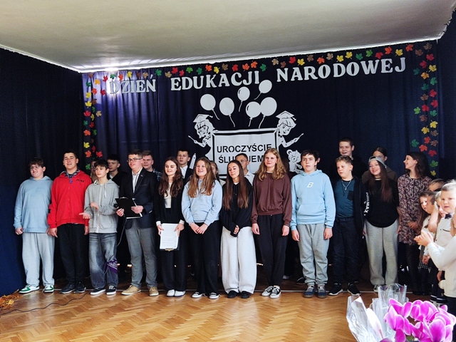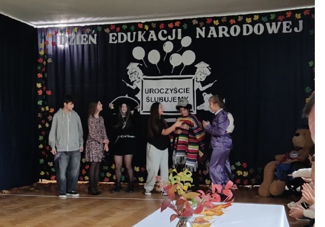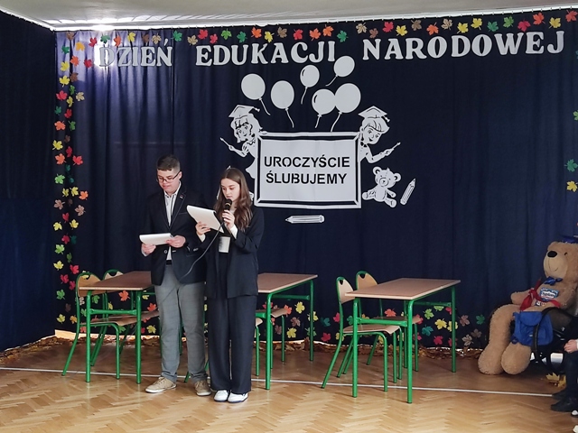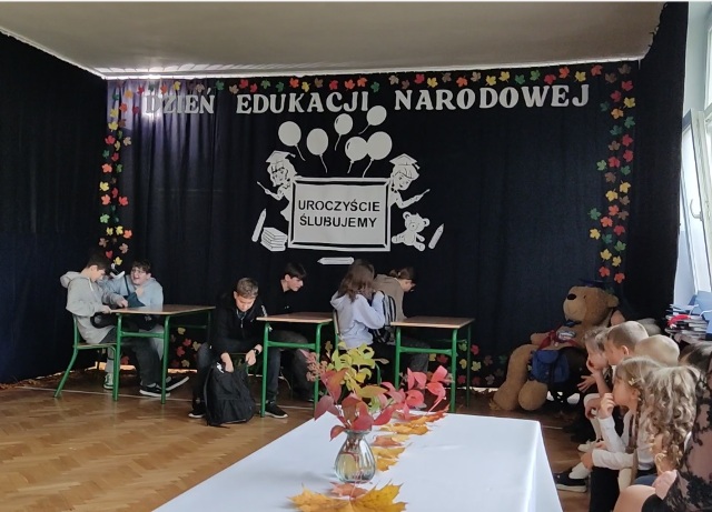 Z okazji Dnia Edukacji Narodowej uczniowie klasy siódmej oraz ósmej przygotowali zabawną pantomimę pt. „Sztuczna inteligencja kontra uczniowie”. W humorystyczny sposób pokazali w niej szkolną rzeczywistość . Według Sztucznej Inteligencji idealna szkoła to miejsce maksymalnego skupienia na wynikach w nauce i sporcie, w której nie ma miejsca na przyjaźnie i inne personalne interakcje z innymi ludźmi. Na szczęście uczniowie udowodnili, że żadne nowinki techniczne nie zastąpią ludzkiego umysłu, humoru i szkolnej przyjaźni. Każdy w szkole jest ważny – razem tworzymy całość. Mimo iż Sztuczna Inteligencja jest bardzo pomocna, to nie zastąpi nam pracowników szkoły i nauczycieli w życiu codziennym. Na zakończenie uroczystości uczniowie przekazali nauczycielom słowa wdzięczności i podziękowania. Był to dzień pełen wzruszeń, uśmiechu i radości – taki, który na długo pozostanie w pamięci wszystkich uczestników.