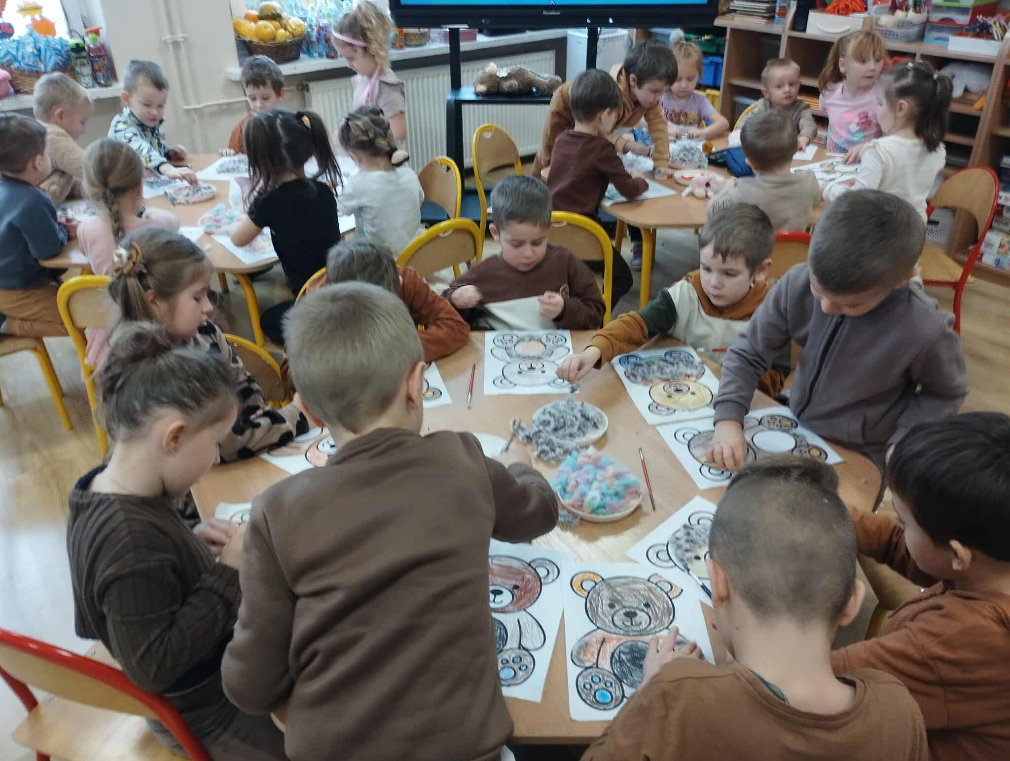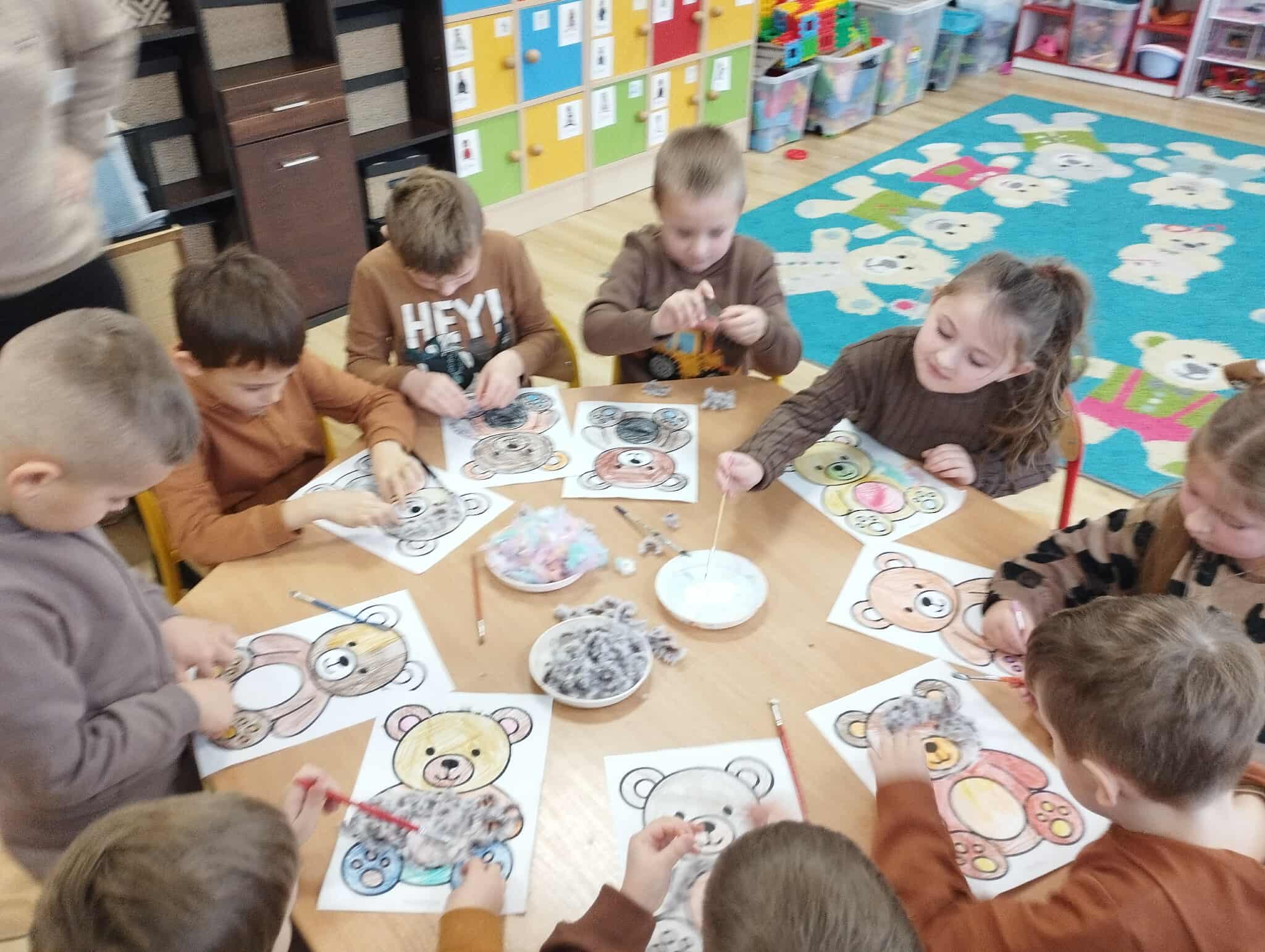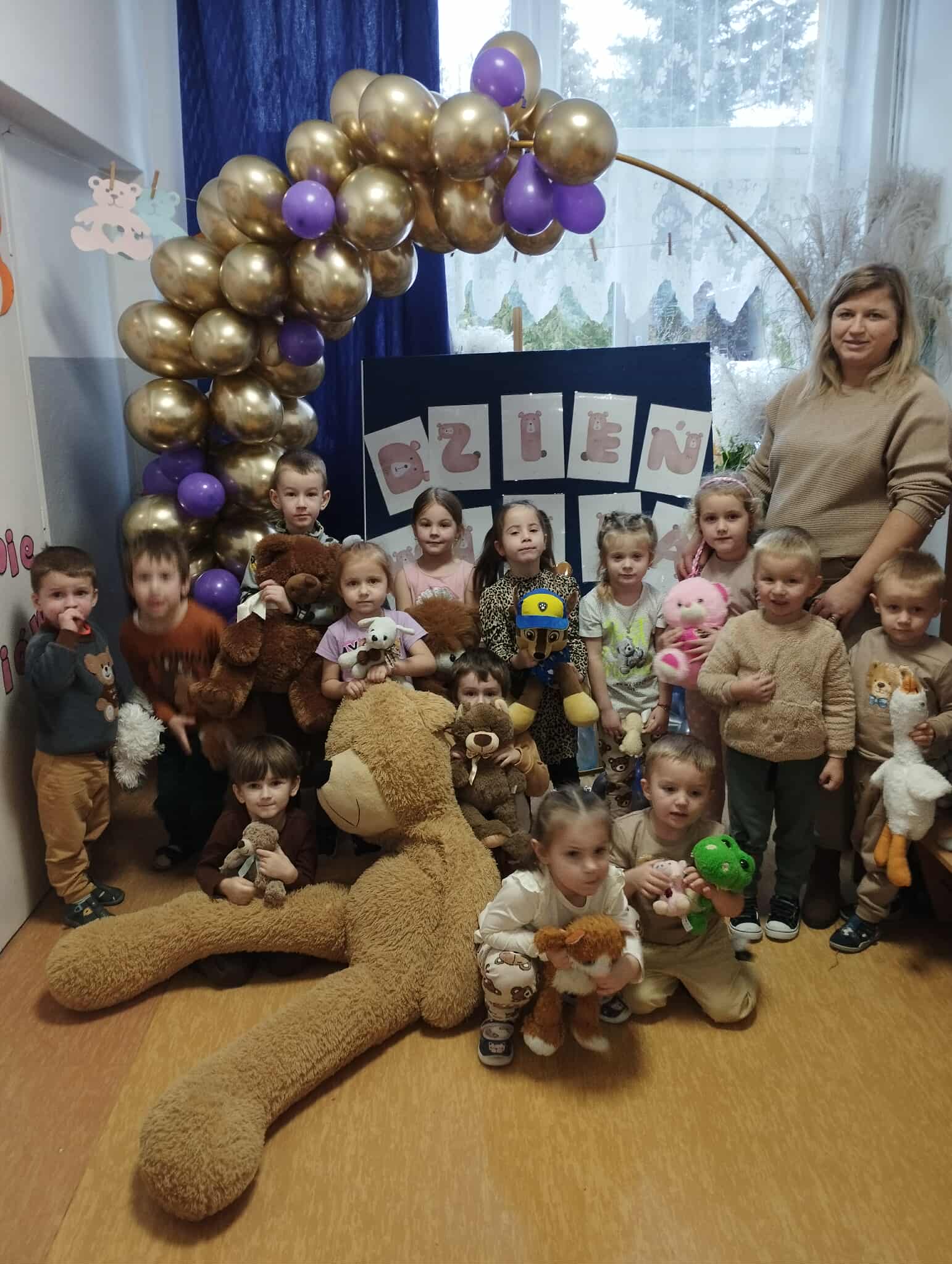 Do naszej szkoły również przybył dzień wcześniej ogromny pluszowy Miś, który gabarytami znacznie odbiegały od standardowych zabawek. Nasi najmłodsi uczniowie z oddziału przedszkolnego były przeszczęśliwe, gdy mogły przytulić się do tak dużej maskotki ( w rękach trzymając swoje ulubione misie przyniesione z domu) i to w dodatku ożywionej? Było mnóstwo misiowych zabaw, piękna praca plastyczna z użyciem mięciutkiej wełny ,skoczne i wesołe piosenki, a także tego co wszystkie misie lubią najbardziej, czyli słodkości. To był wyjątkowy dzień, każdy z pluszaków był wyjątkowy. Ile sekretów, myśli i słów usłyszał przez ten czas każdy z nich, wiedzą tylko one…