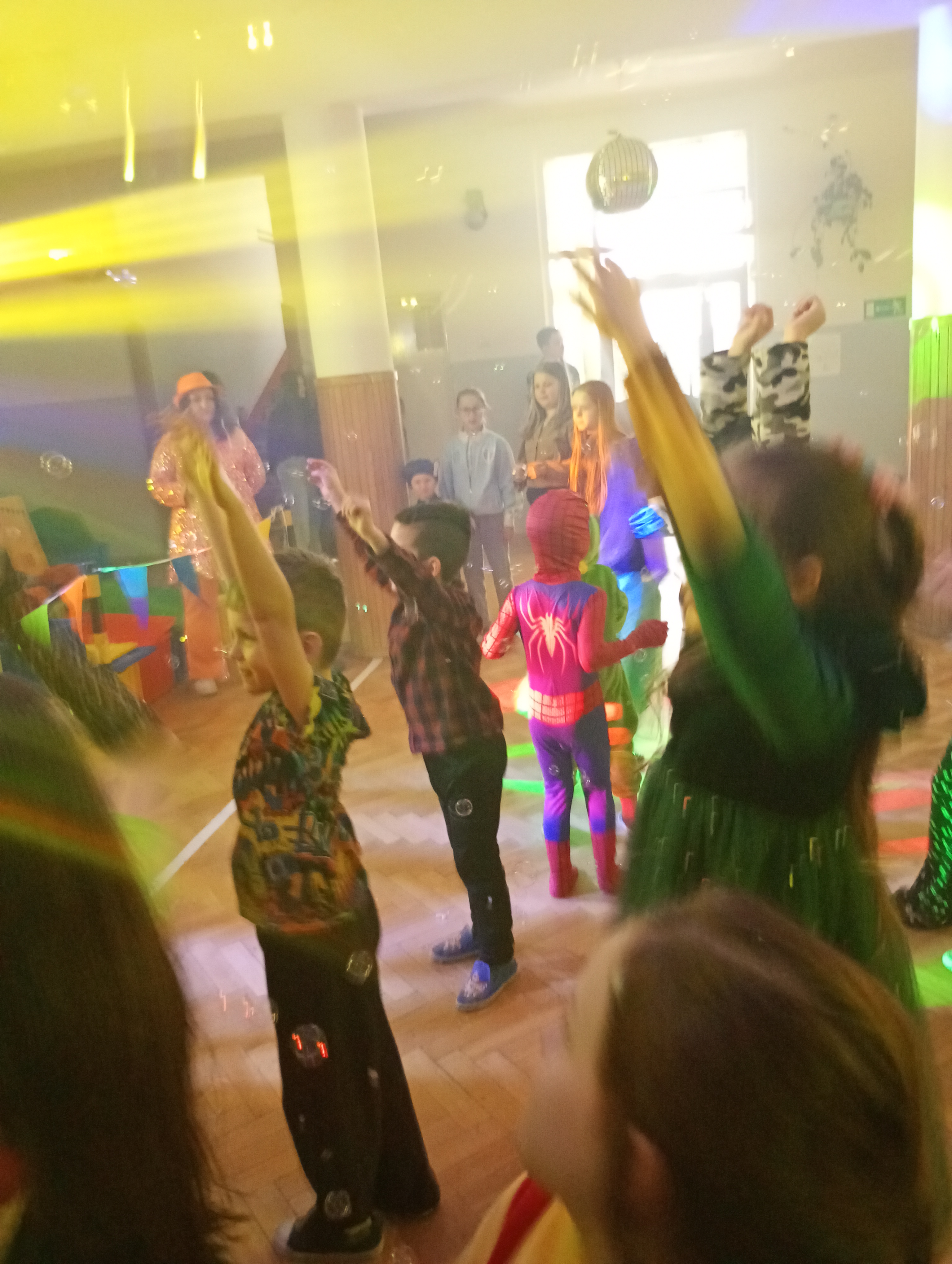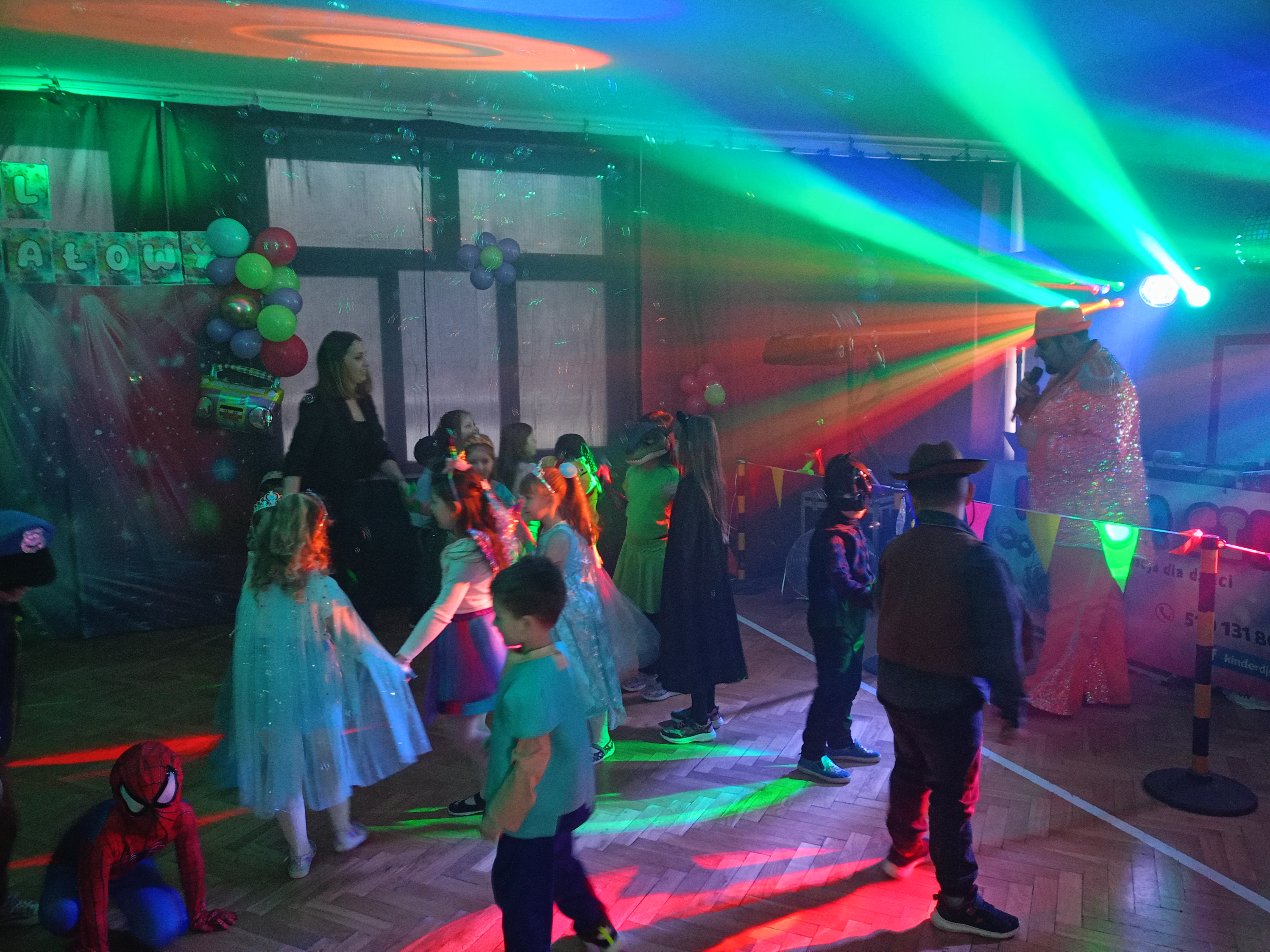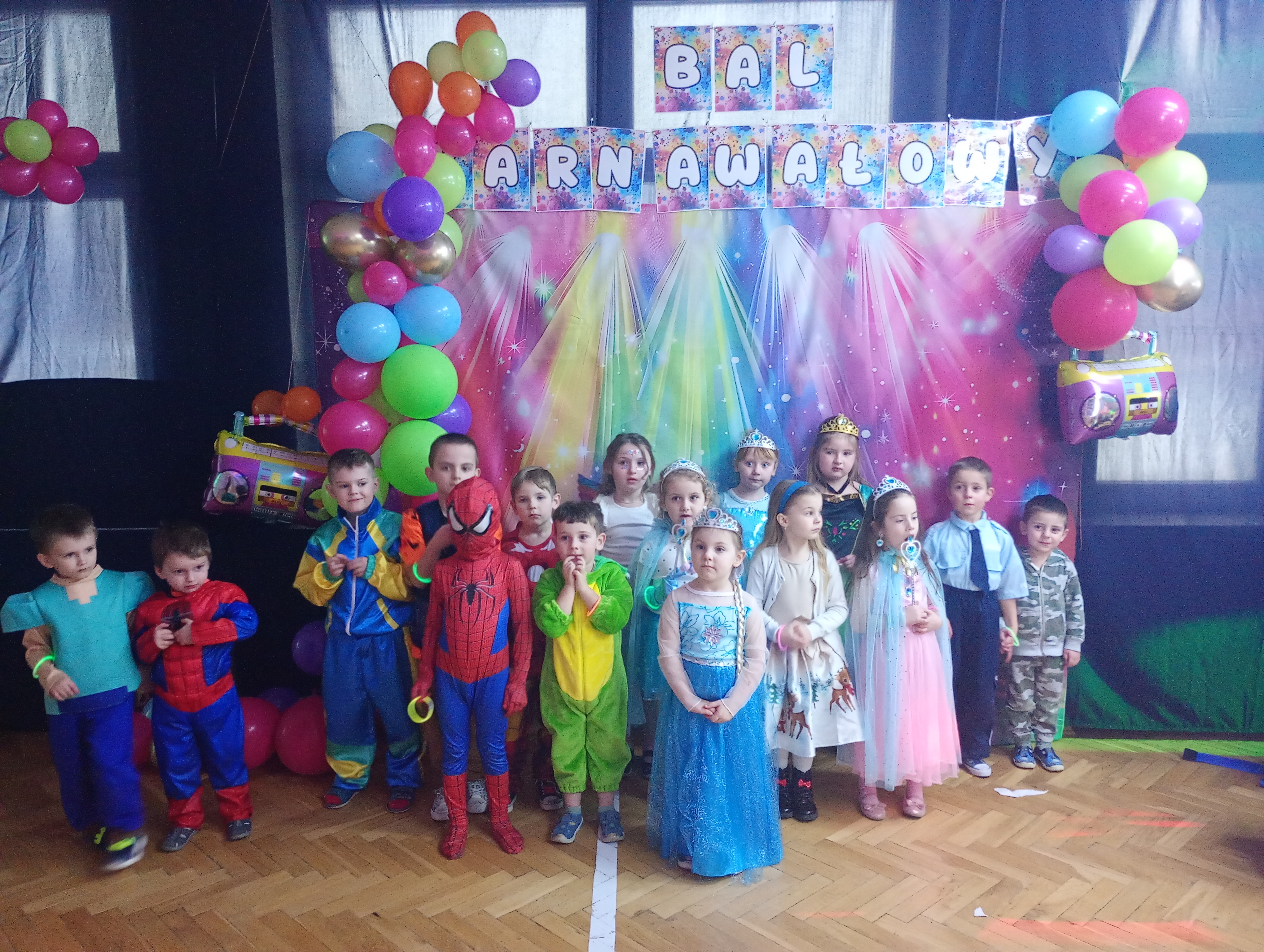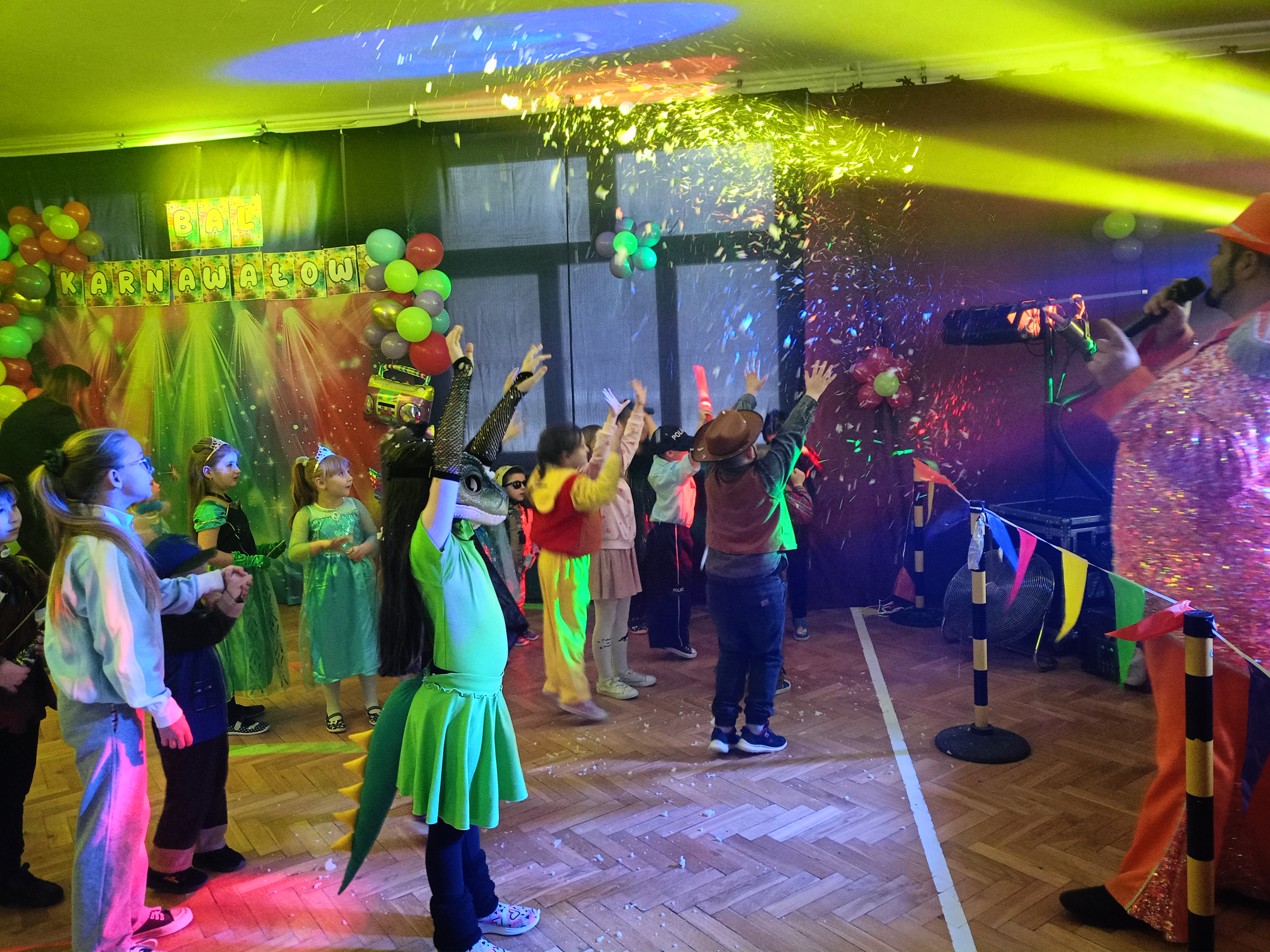 Tak tez było 10 stycznia w sobotę. Piękne stroje karnawałowe, tajemnicze maski, wyszukane atrybuty i nakrycia głowy- to wszystko sprawiło, że nasza sala gimnastyczna zamieniła się w prawdziwą salę balową. Każde z dzieci wcieliło się w wymarzoną postać. Były księżniczki, wróżki, super bohaterowie, policjanci, strażacy a nawet Zorro. Tańce, szaleństwa z kolorowymi piłeczkami, limbo, wariacje z chustą animacyjną, woskowe figury, bańki mydlane i armatki śnieżne. Mnóstwo kolorowych świateł, skoczna muzyka, przy której unoszący się ciężki dym, dodawał efektu WOW ! To wszystko zasługa naszych wspaniałych animatorów Kinder SID, którzy w pełni profesjonalnie zorganizowali zabawy nie tylko dla najmłodszych, lecz i tych nieco starszych uczniów naszej szkoły. Z pewnością nikt nie podpierał ściany, tylko świetnie się bawił.