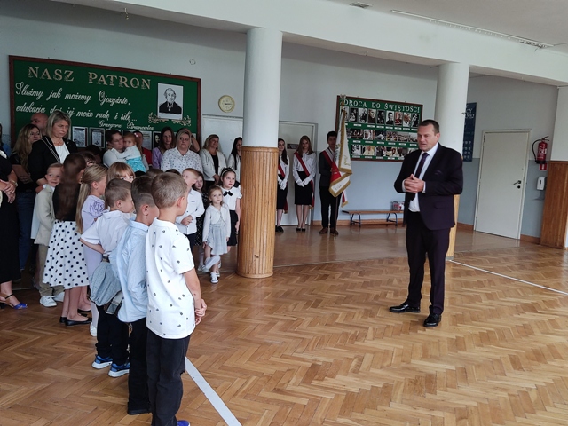 Bo dzieci niosą na swoich barkach emocje, których my – dorośli – często nie widzimy. A to, co usłyszą w tych pierwszych dniach, zostanie z nimi na długo. Dlatego w nowym roku szkolnym nie życzmy dzieciom samych piątek ani czerwonych pasków, ale tej prawdziwej mądrości, o której mówił podczas mszy świętej ksiądz Zdzisław. Tej mądrości życiowej, aby młodzi ludzie nie tylko dorastali w latach ale przede wszystkim, żeby w nich dojrzewali, Aby dojrzale i z otwartym umysłem podeszli do tego co wskazują im nauczyciel poprzez przekazywane wiadomości i wartości. Aby dojrzale chcieli pogłębiać swoją wiedze, a w przyszłości być dumą dla swoich rodziców, opiekunów i nich samych- o czym we wstępie powiedział pan dyrektor Jerzy Świstak, witając wszystkich rodziców, dzieci, nauczycieli i pracowników szkoły.