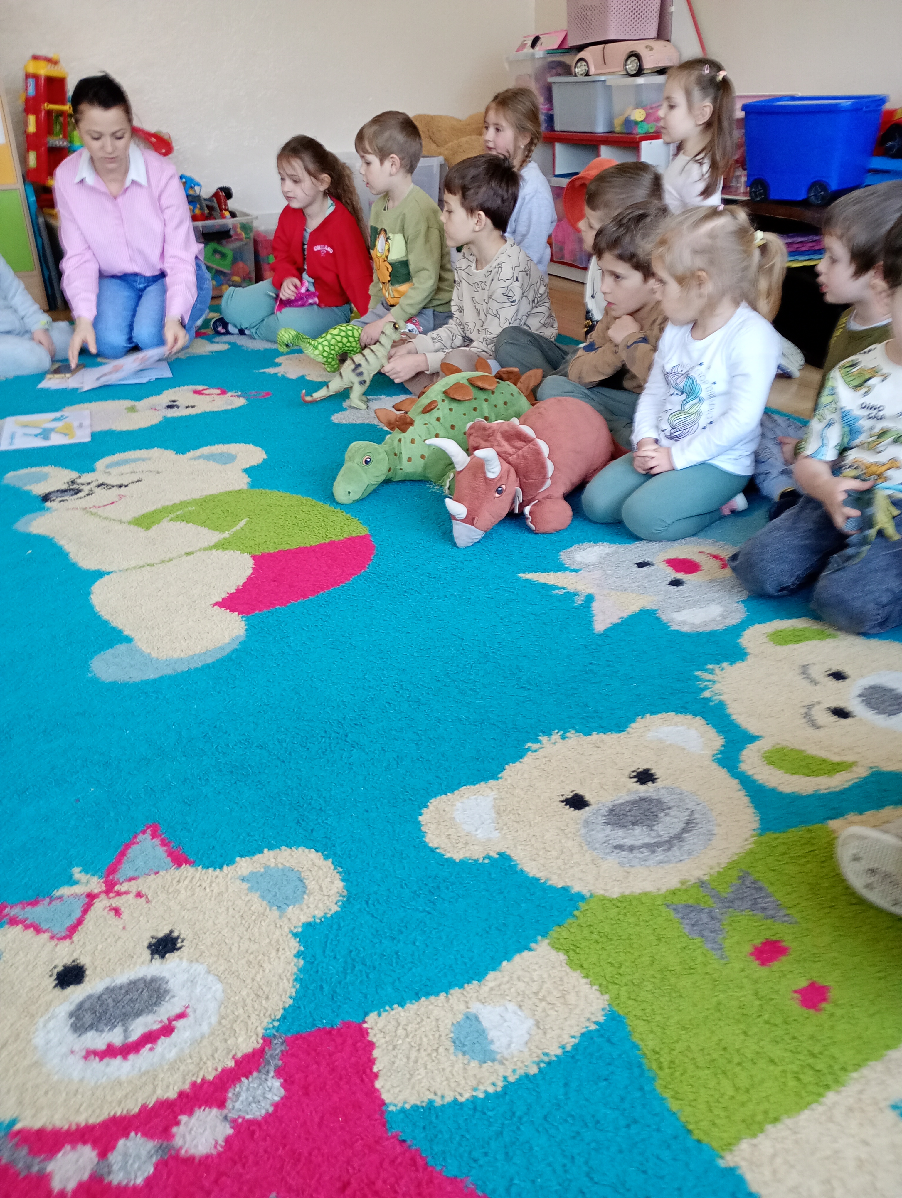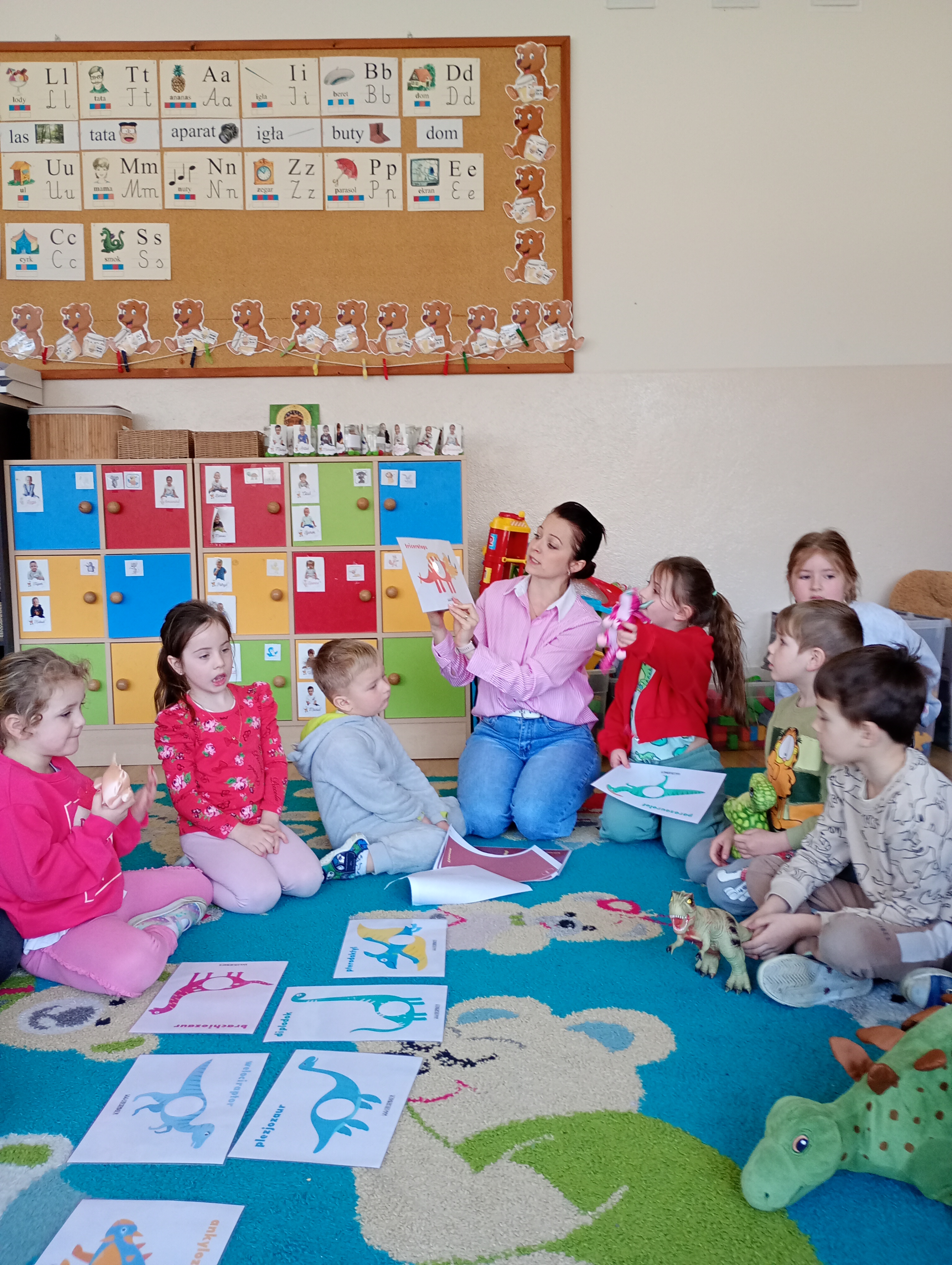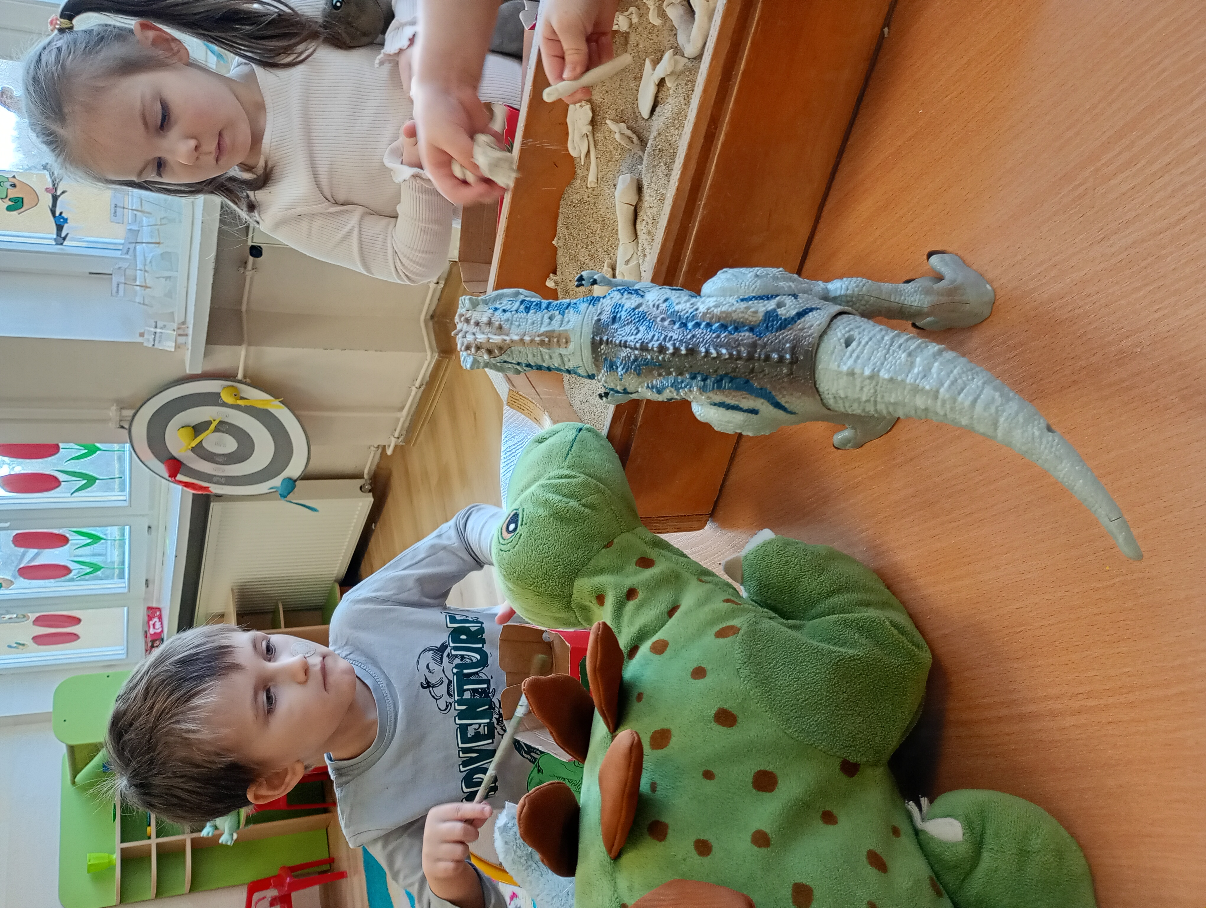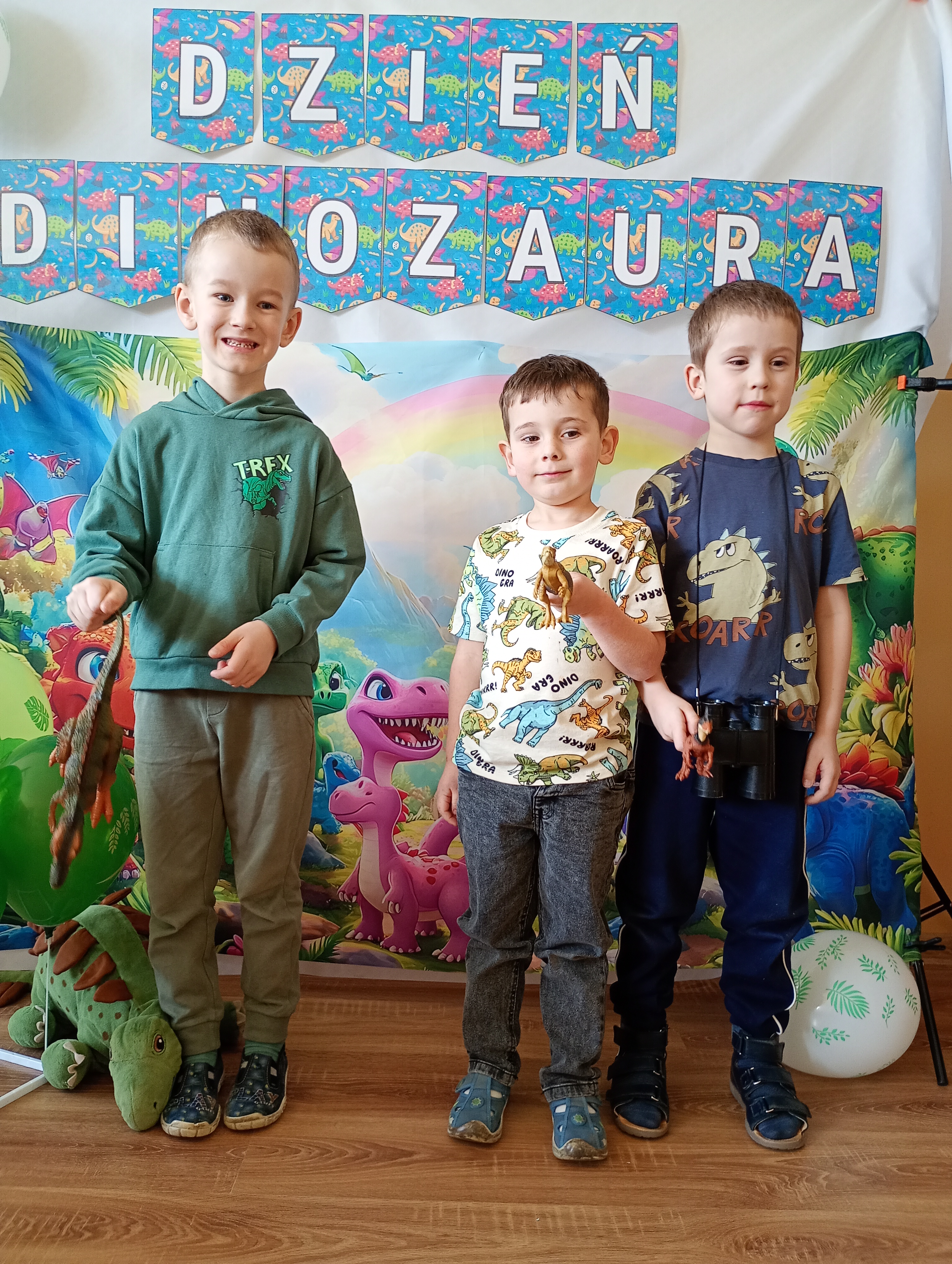 Nasze sale wypełniły się „strasznie śmiesznymi jaszczurami”, a to wszystko za sprawą naszych wychowanków, którzy tego dnia założyli wyjątkowe ubrania z motywami dinozaurów. Od samego rana panowała atmosfera ekscytacji i odkrywania tajemnic przeszłości. Dzieci zaskakiwały nas ogromną wiedzą w tym temacie, znały nazwy dinozaurów- nawet te z serii „językołamaczy”.