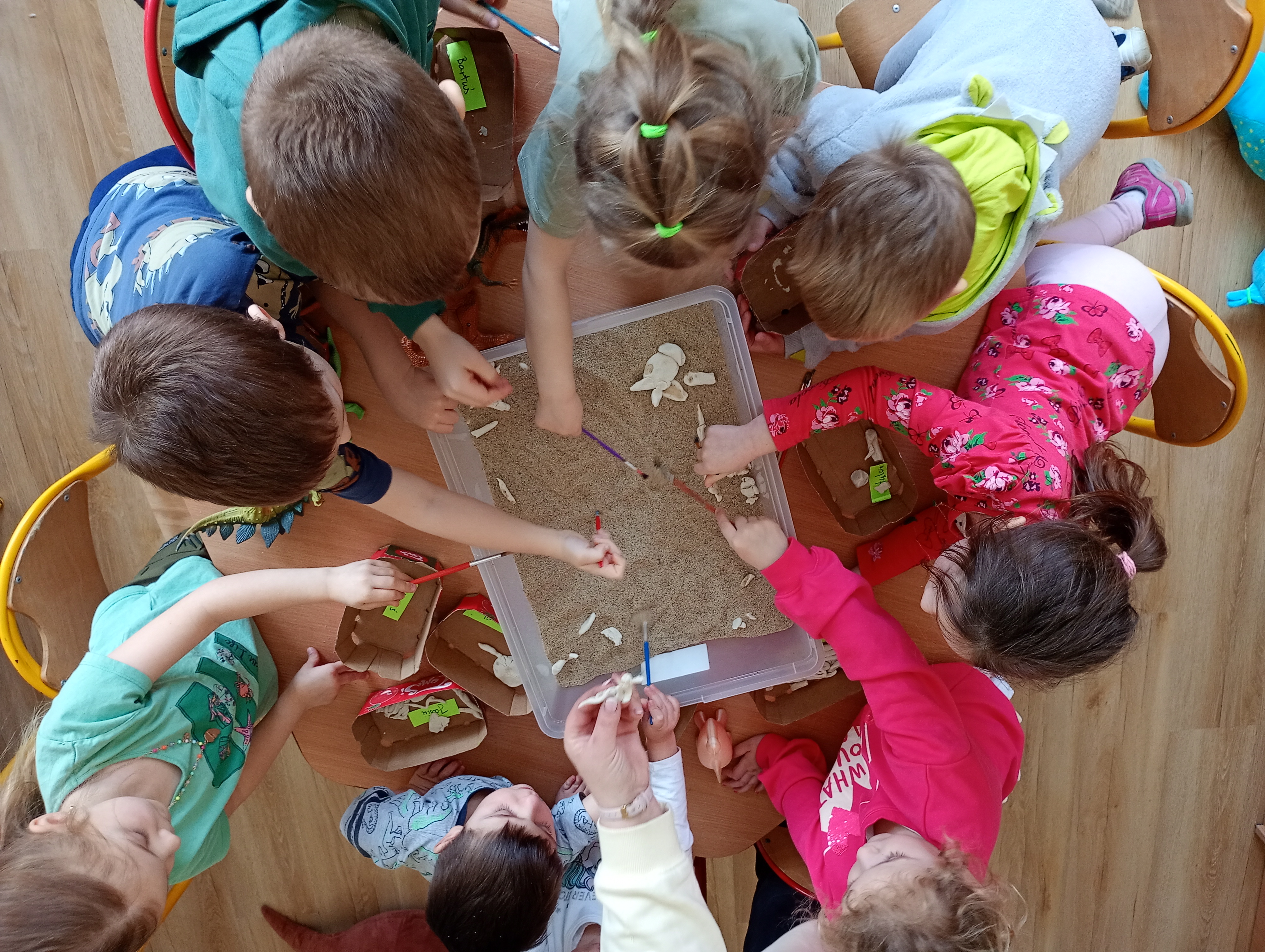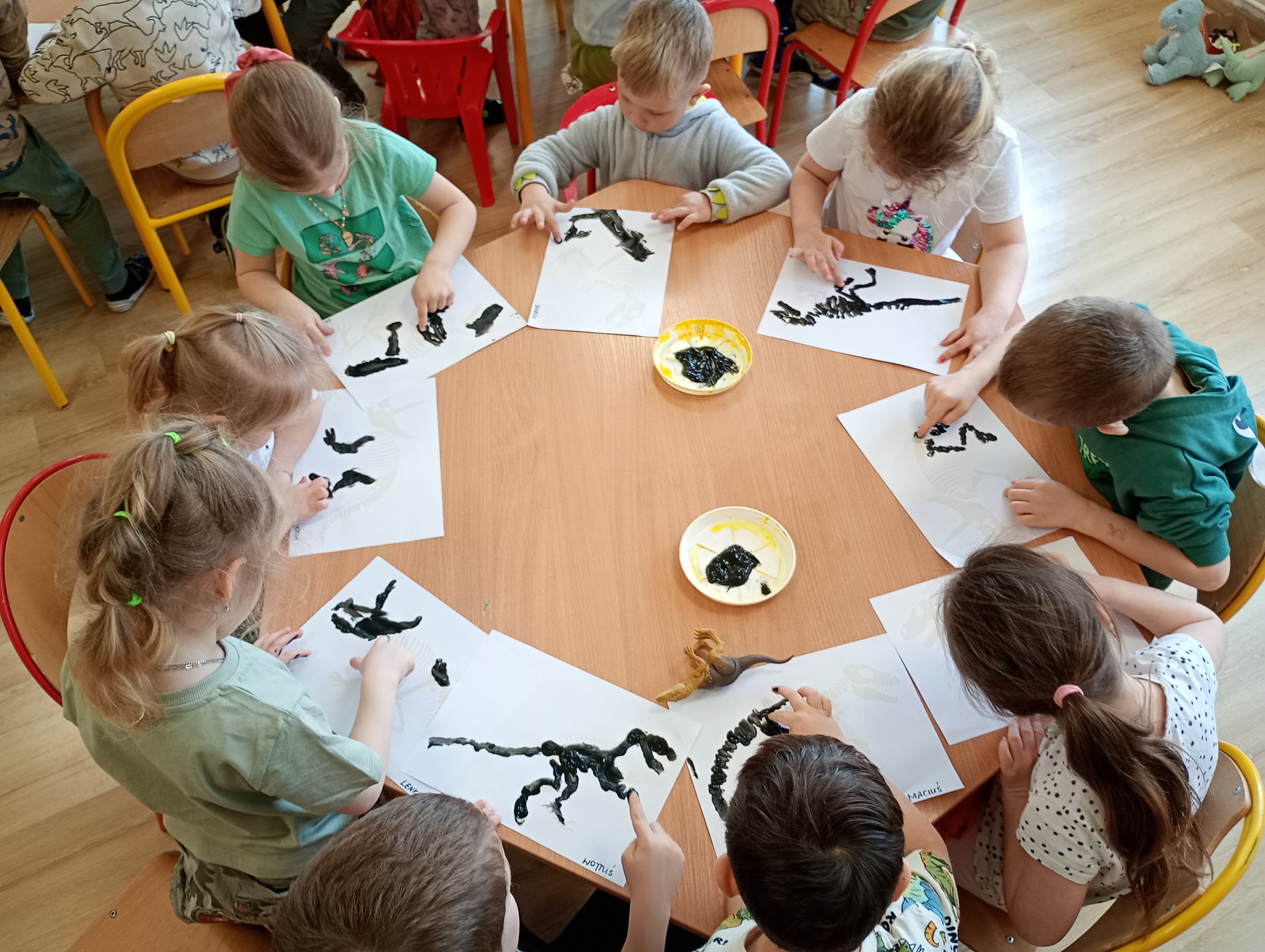 Podczas zajęć stolikowych dzieci pracowały z modelami szkieletów dinozaurów. Wykorzystując czarną farbę i swoje paluszki, przedszkolaki precyzyjnie obrysowywały kształty kości, tworząc własne dokumentacje znalezisk. Zadanie to wymagało dużego skupienia i pomogło dzieciom zrozumieć budowę anatomiczną tych wielkich gadów.