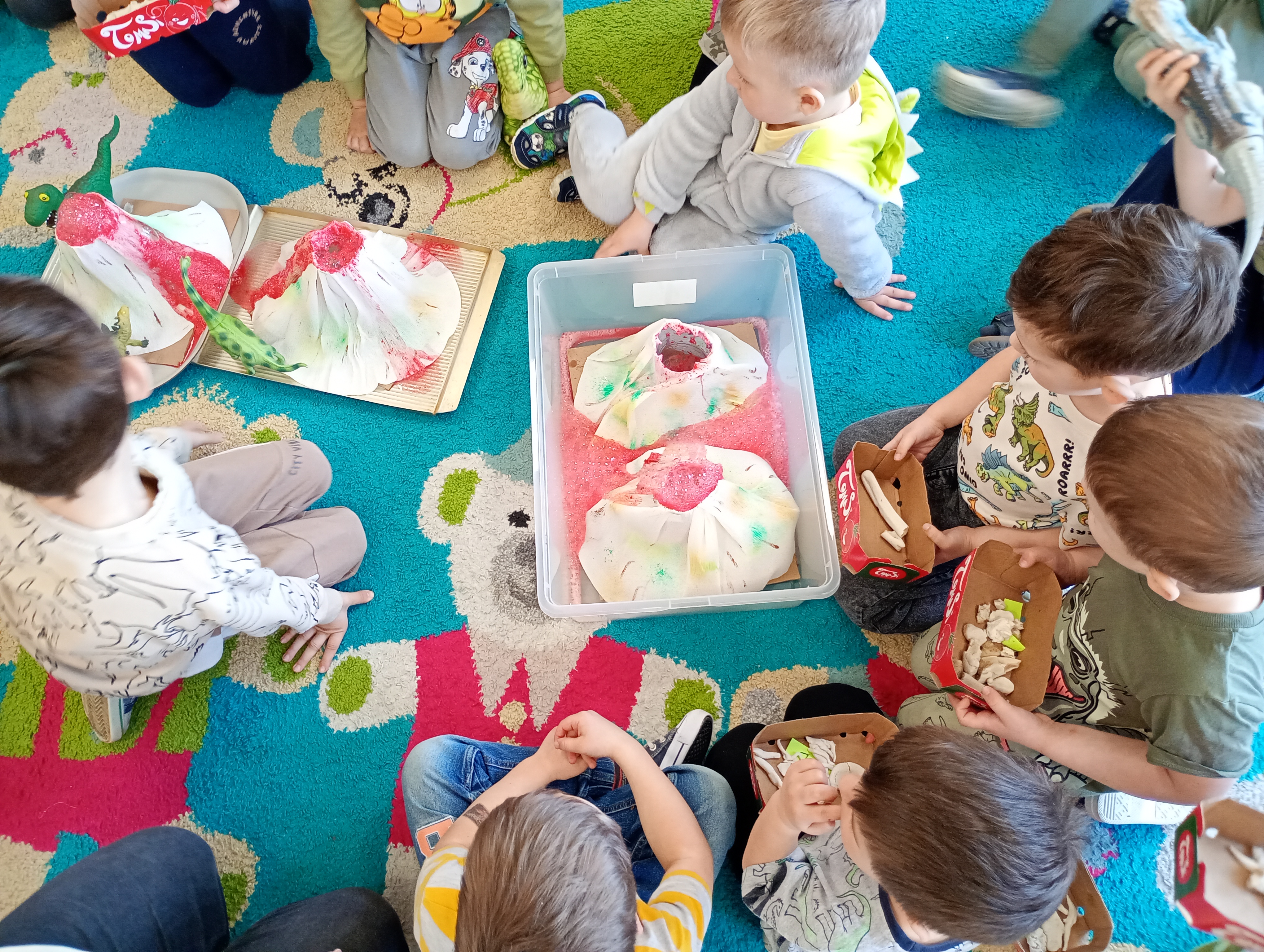 Kluczowym punktem dnia było stworzenie makiety wulkanu. Dzieci z zaciekawieniem obserwowały reakcję chemiczną sody oczyszczonej z octem i barwnikiem. Efektowna, „lawowa” piana wywołała mnóstwo radości i stała się wstępem do rozmowy o tym, jak wyglądała Ziemia w czasach prehistorycznych.