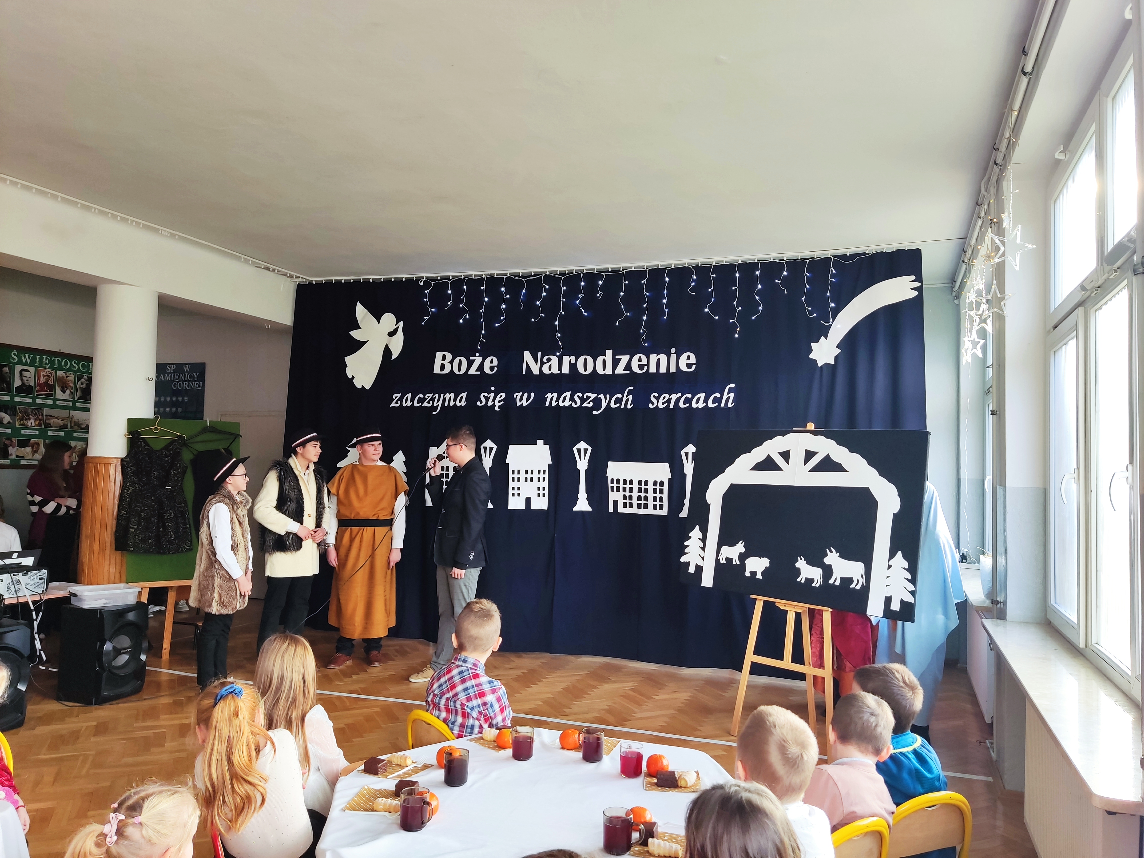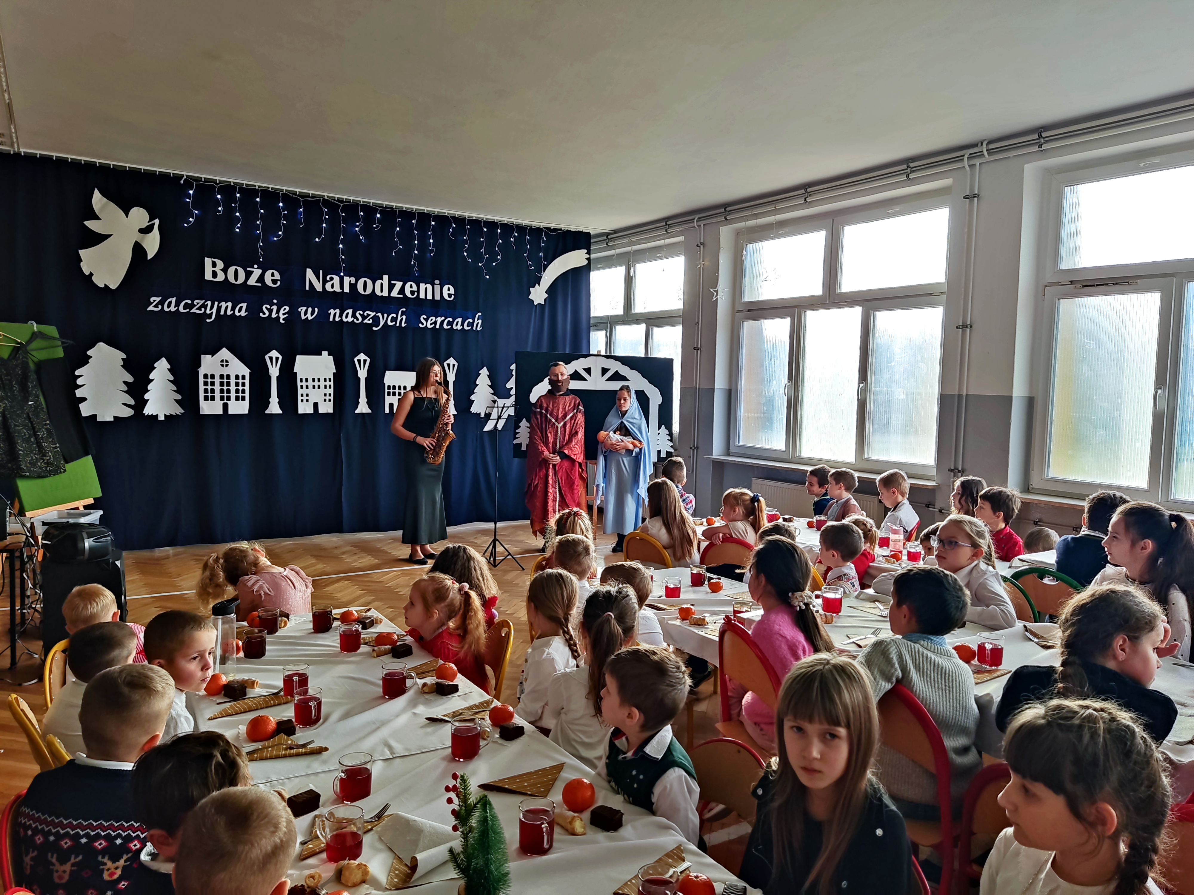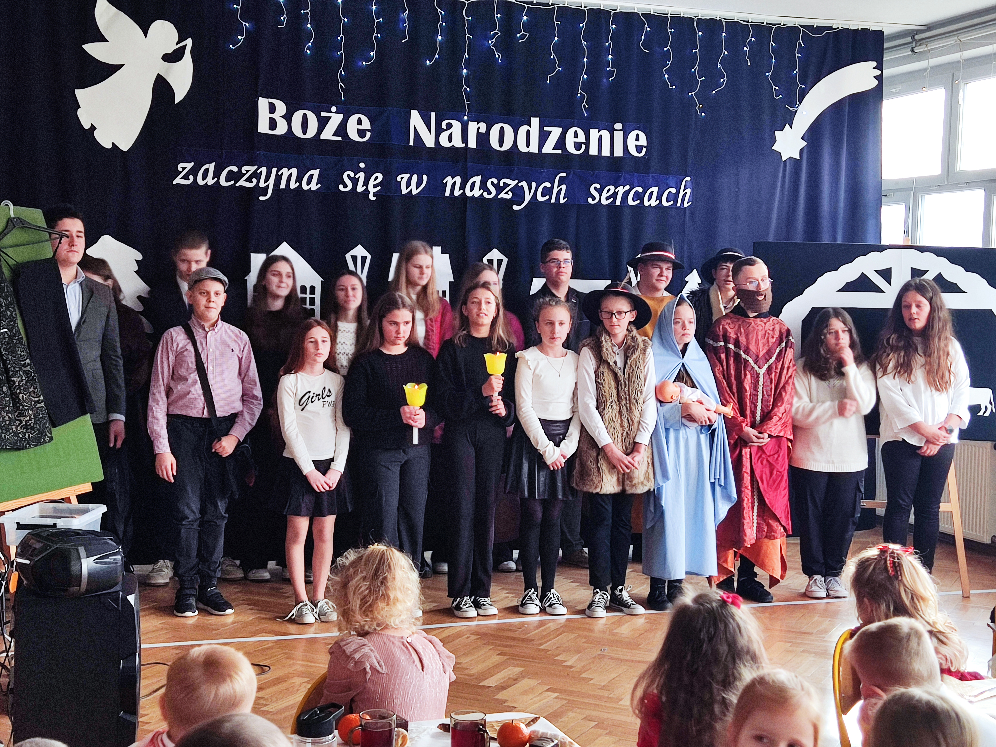 Spotkanie wigilijne rozpoczęło się od obejrzenia występu uczniów, czyli jasełek. Przedstawienie w niezwykły sposób połączyło tradycje ze współczesnością i miało na celu odpowiedzieć na pytanie, czym dla ludzi są święta Bożego Narodzenia. Scenki ukazywały ulicę pełną zapracowanych, zabieganych, często samotnych i poszukujących bliskości współczesnych ludzi oraz biblijną historię narodzin Jezusa. Zawierały one ponadczasowe przesłanie dla widzów: Boże Narodzenie zaczyna się w naszych sercach. Tegoroczne jasełka „Wigilijna ulica” uświadomiły nam, że prawdziwe święta polegają na bliskości, dzieleniu się dobrem, przebaczaniu, czyli odkrywaniu w drugim człowieku obecności Chrystusa. Wspaniałym występom uczniów towarzyszyła muzyka, a tradycyjne kolędy i pastorałki wprowadzały całą społeczność szkolną w świąteczny nastrój.