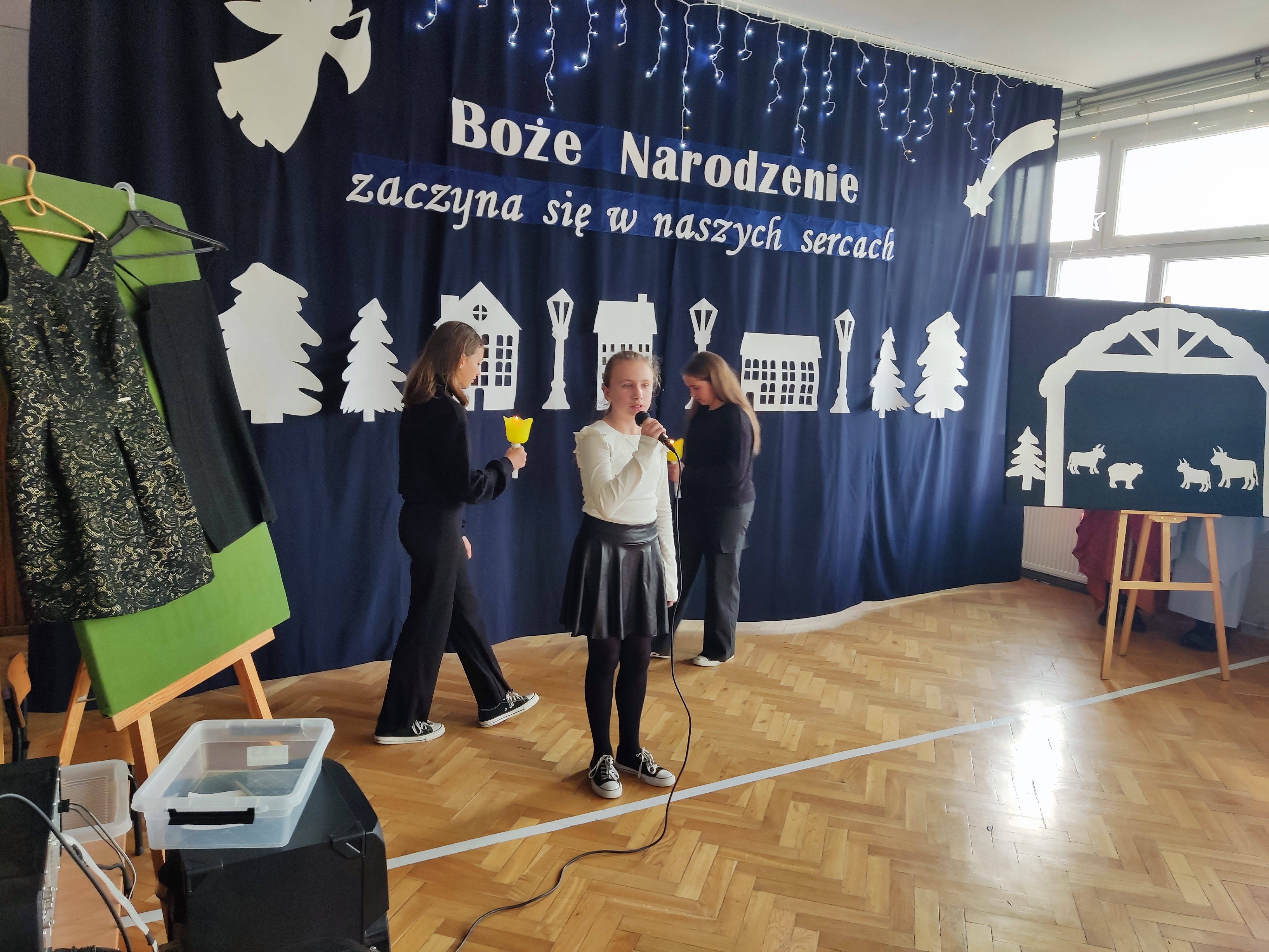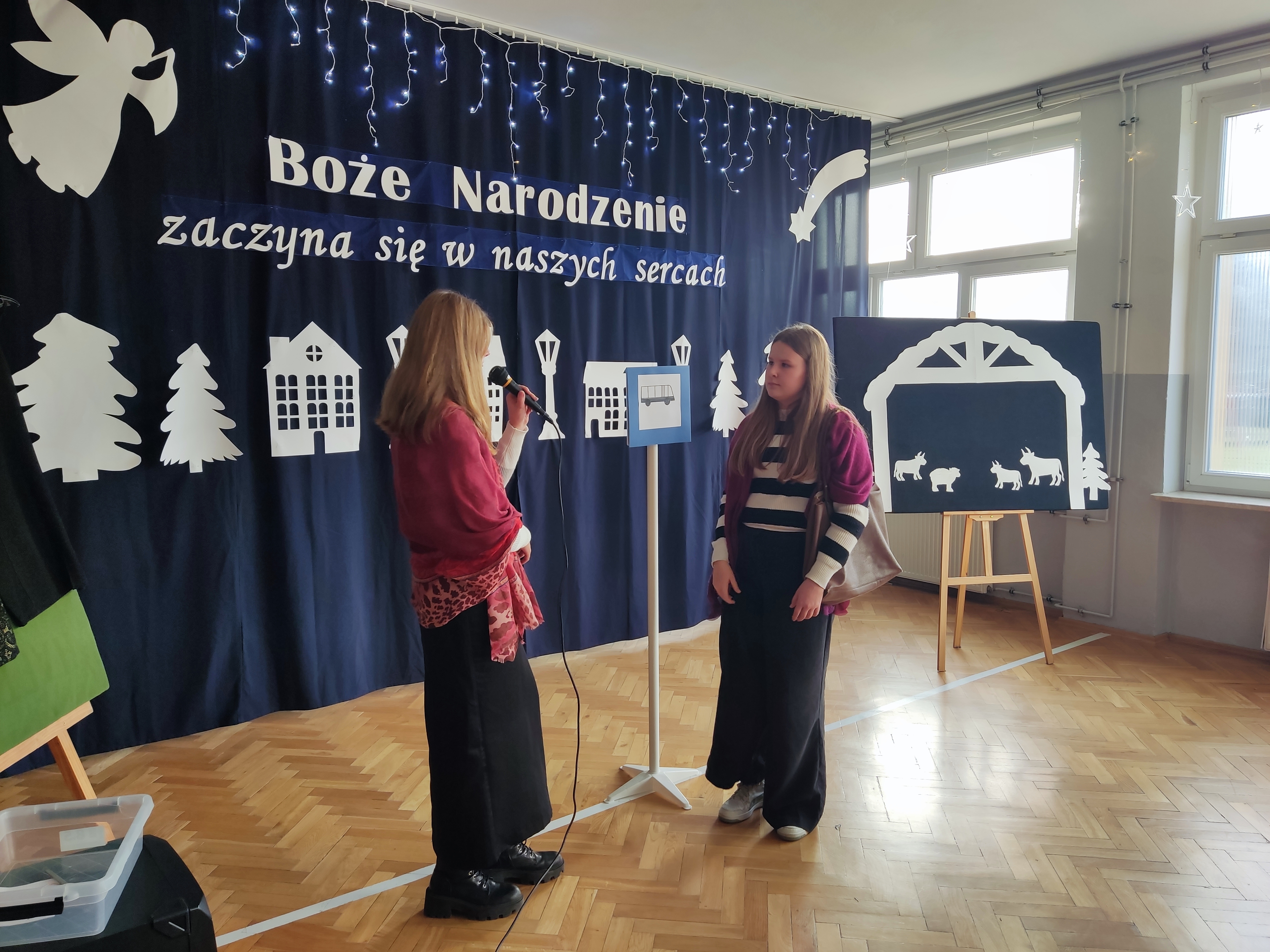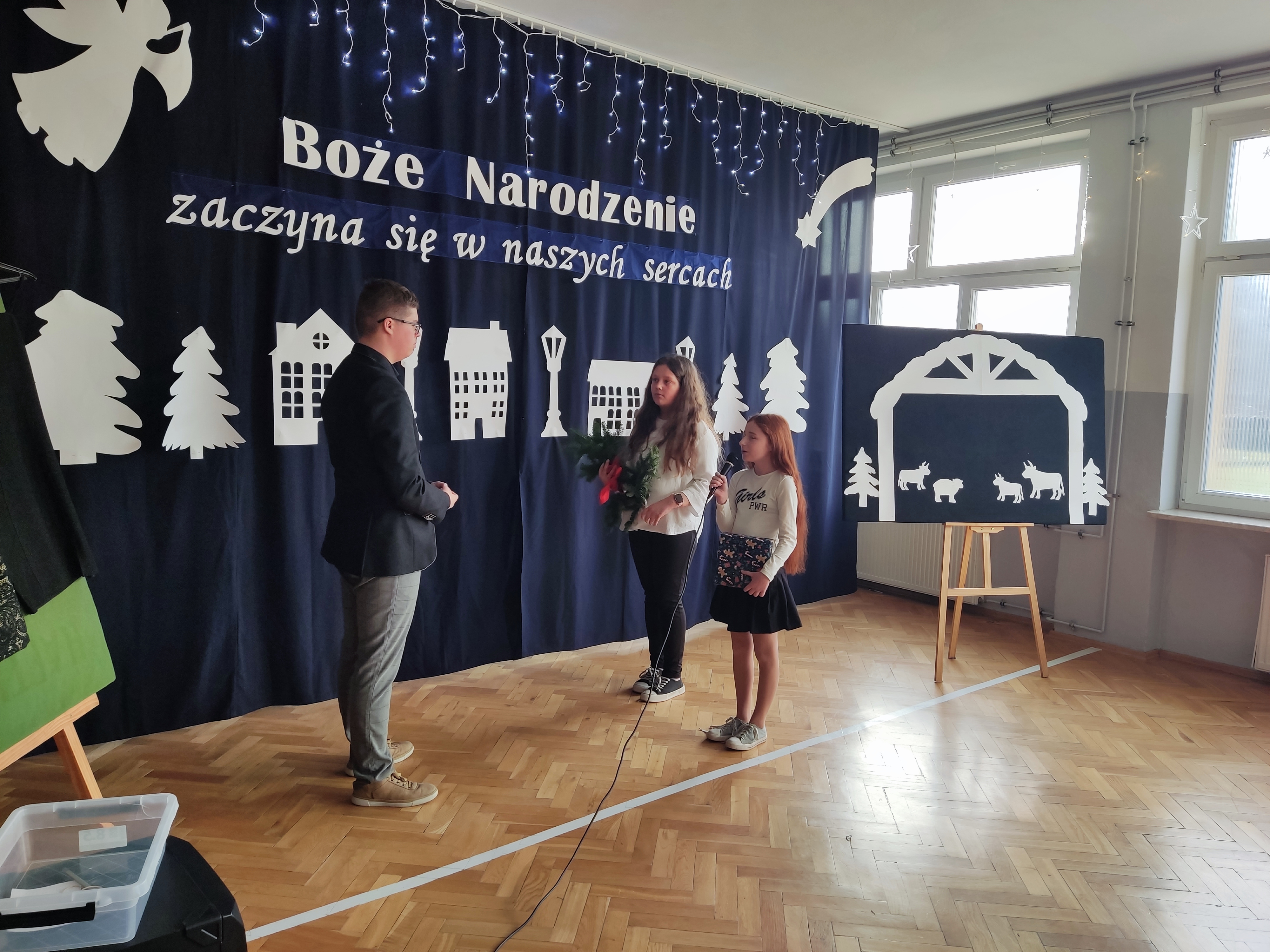 Spotkanie wigilijne rozpoczęło się od obejrzenia występu uczniów, czyli jasełek. Przedstawienie w niezwykły sposób połączyło tradycje ze współczesnością i miało na celu odpowiedzieć na pytanie, czym dla ludzi są święta Bożego Narodzenia. Scenki ukazywały ulicę pełną zapracowanych, zabieganych, często samotnych i poszukujących bliskości współczesnych ludzi oraz biblijną historię narodzin Jezusa. Zawierały one ponadczasowe przesłanie dla widzów: Boże Narodzenie zaczyna się w naszych sercach. Tegoroczne jasełka „Wigilijna ulica” uświadomiły nam, że prawdziwe święta polegają na bliskości, dzieleniu się dobrem, przebaczaniu, czyli odkrywaniu w drugim człowieku obecności Chrystusa. Wspaniałym występom uczniów towarzyszyła muzyka, a tradycyjne kolędy i pastorałki wprowadzały całą społeczność szkolną w świąteczny nastrój.